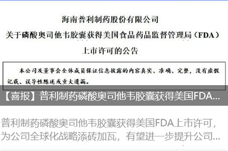 普利制药磷酸奥司他韦胶囊获得美国FDA上市许可!